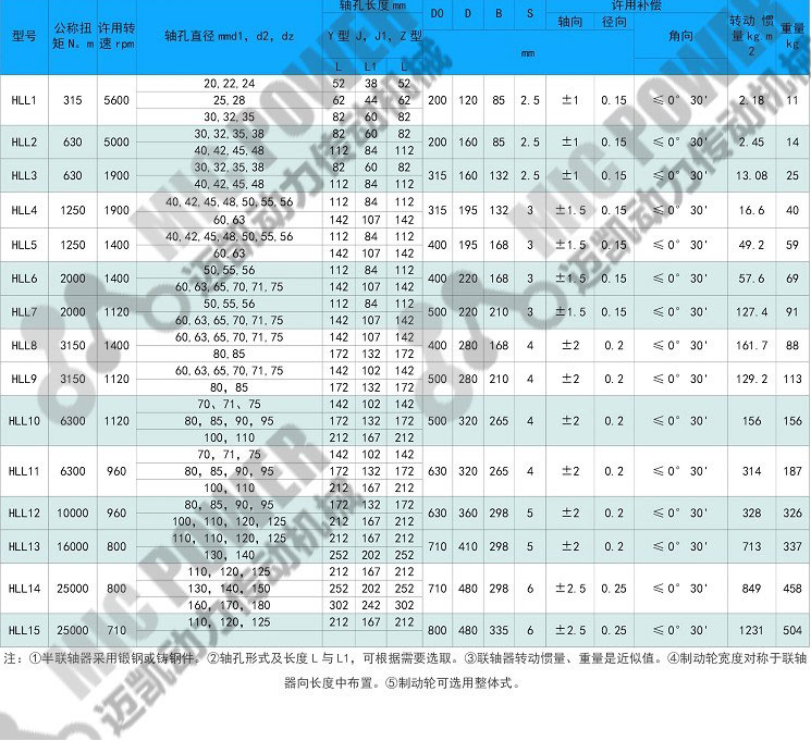HLL型帶制動輪彈性柱銷聯(lián)軸器,制動輪柱銷聯(lián)軸器,LXZ型(原HLL型)-彈性柱銷聯(lián)軸器(GB5014-2003)   本聯(lián)軸器已列為標(biāo)準GB5014-85,適用于各種機械聯(lián)接兩同軸線的傳動軸,通常用于動頻繁的高低速運動。工作溫度為-20 ~+80℃;傳遞公稱扭矩為40~20000N.m。 軸孔型式有圓柱形(Y)、圓錐形(Z)和短圓柱形(J)。軸孔和鍵槽按標(biāo)準GB3852-83《聯(lián)軸器軸柱和鍵槽形式及尺寸》的規(guī)定加工。半聯(lián)軸器采用精密鑄造,鑄鐵HT20-40、鑄鋼ZG35Ⅱ,軸孔和鍵槽采用拉制成型,柱銷采用MC尼龍b制成。http://www.btmcjx.com 彈性柱銷聯(lián)軸器具有較大結(jié)構(gòu)簡單、合理,維修方便、兩面對稱可互換,壽命長,允許較大的軸向竄動,具有緩沖、減震、耐磨等性能。 彈性柱銷聯(lián)軸器是利用若干非金屬彈性材料制成的柱銷,置于兩半聯(lián)軸器凸緣孔中,通過柱銷實現(xiàn)兩半聯(lián)軸器聯(lián)接,該聯(lián)軸器結(jié)構(gòu)簡單,容易制造,裝拆更換彈性元件比較方便,不用移動兩半聯(lián)軸器。彈性元件(柱銷)的材料一般選用尼龍,有微量補償兩軸線偏移能力,彈性件工作時受剪切,工作可靠性,僅適用于要求很低的中速傳動軸系,不適用于工作可靠性要求較高的工況. LXZ型(原HLL型)-彈性柱銷聯(lián)軸器基本參數(shù)和主要尺寸:規(guī)格:HLL1-15,公稱轉(zhuǎn)矩315-25000,許用轉(zhuǎn)速5600-710,軸孔直徑20-180,軸孔長度38-302,重量11-504,材質(zhì):鑄鐵,鑄鋼,精鋳。